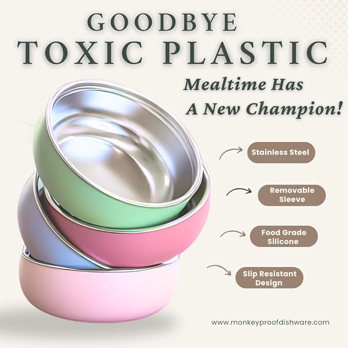 - WORRY AND HASSLE FREE: Monkey Proof stainless and silicone bowls won’t shatter like glass, leach toxic chemicals into your kids food like plastic and bamboo, or fly off the table and clatter like regular stainless steel dishes. These bowls are easy to clean (Dishwasher Safe), stain resistant, and unbreakable!