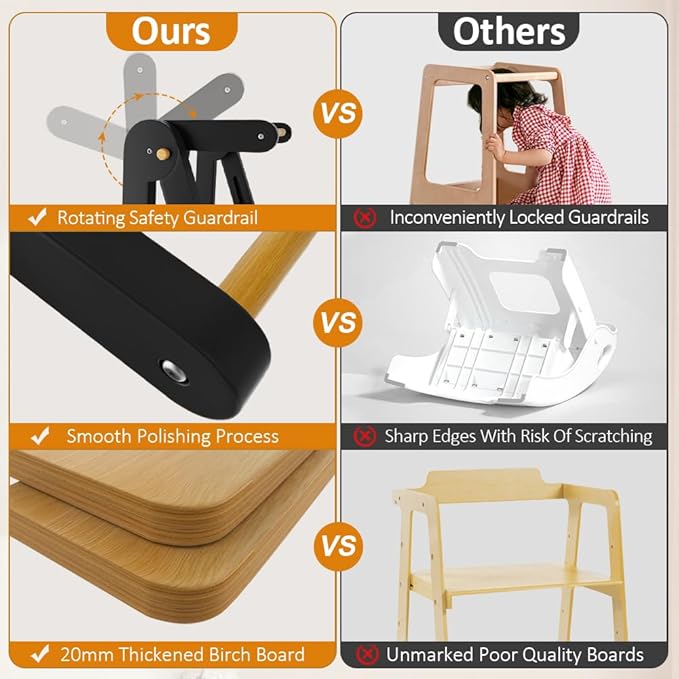 - [UPGRADED QUADRUPLE SAFETY AND SECURITY DESIGN] The safety of baby is our top priority. The Bilateral anti tipping feet and stable pyramid structure ensures maximum stability of the kids step stool, the rotatable and lockable safety guardrail prevents any falls, thicken multi-layer birch wood board can bear up to 200 pounds, and the smooth polishing process ensures that the product has no burrs, caring for the delicate skin of baby.