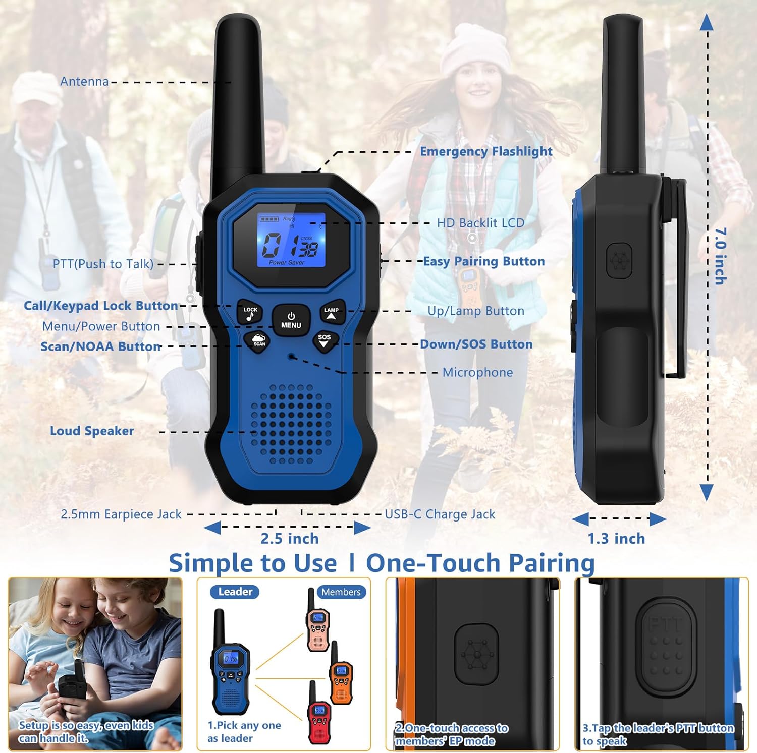 - 【Kid-Friendly, Adult-Approved】:Simple to use with one-touch pairing. So intuitive, even the youngest family member can operate. Plus, adults will love the advanced features it packs, such as double FRS channels monitor, auto scan all FRS channels, keypad lock, etc. Ranked high in EASY TO USE and PERFECT FOR ALL AGES, your walkie talkies make a thoughtful gift. Encourage outdoor play, teamwork, and imaginative conversations, all while staying in touch