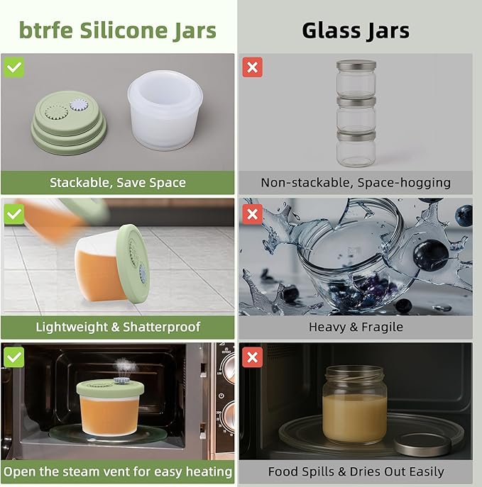 - 💌 Effortless Cleaning & Lifetime Durability: Dishwasher-safe for hassle-free cleanup. Unlike brittle glass or warping plastic, our silicone jars resist stains, odors, and deformation. Reusable for years—save money and the planet!