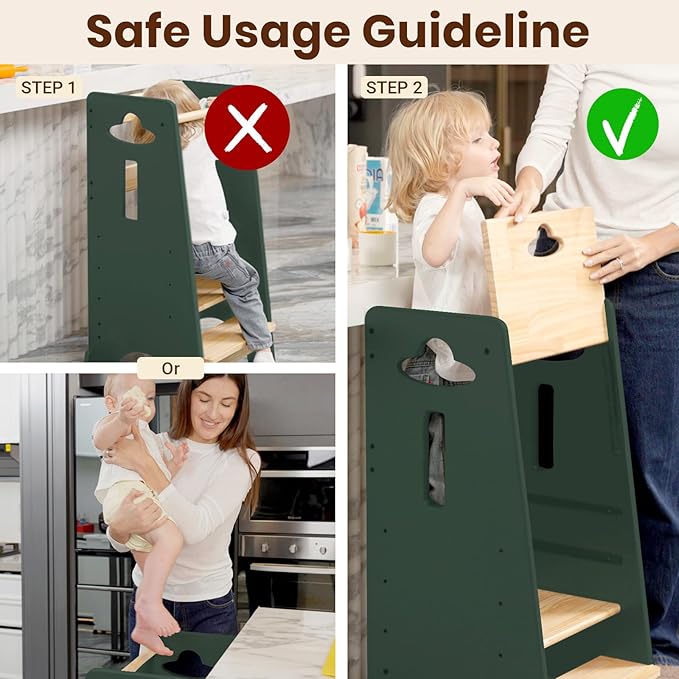 - Family Cooking Fun: This toddler kitchen learning helper elevates your child to the most common kitchen countertop heights. It allows your little one to easily join in family activities, creating a more joyful and harmonious atmosphere at home. It encourages kids to learn cooking, prepare food, wash dishes, or brush their teeth in the bathroom.