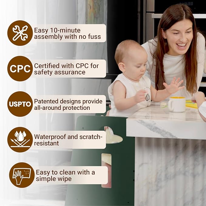 - Three-Level Adjustable Learning Stool: This adaptable kitchen tower is designed for kids of different heights. Toddlers and children aged 18 months to 6 years can easily use it to reach the kitchen island, counter, or sink. It grows with your child, making it a long-lasting investment in your family’s daily life.