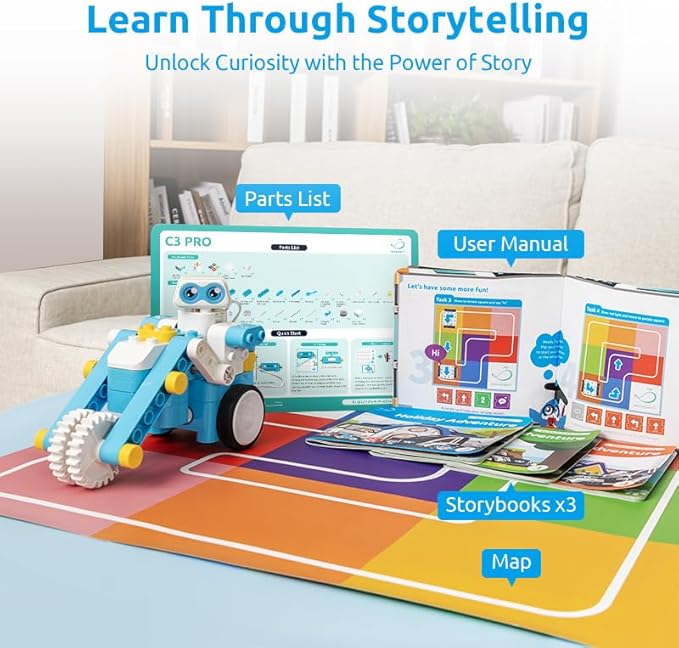 - 【Easy & Fun for Young Kids – The Perfect First Coding Kit】C3Pro is the ideal introduction to STEM for young learners aged 4-6. With cheerful illustrations, engaging story tasks, and colorful coding cards, it turns early coding into a fun and stress-free experience. Kids are gently guided through each step, building confidence as they play. All parts are neatly packed in a sectioned storage box—tidy, organized, and ready for the next adventure!