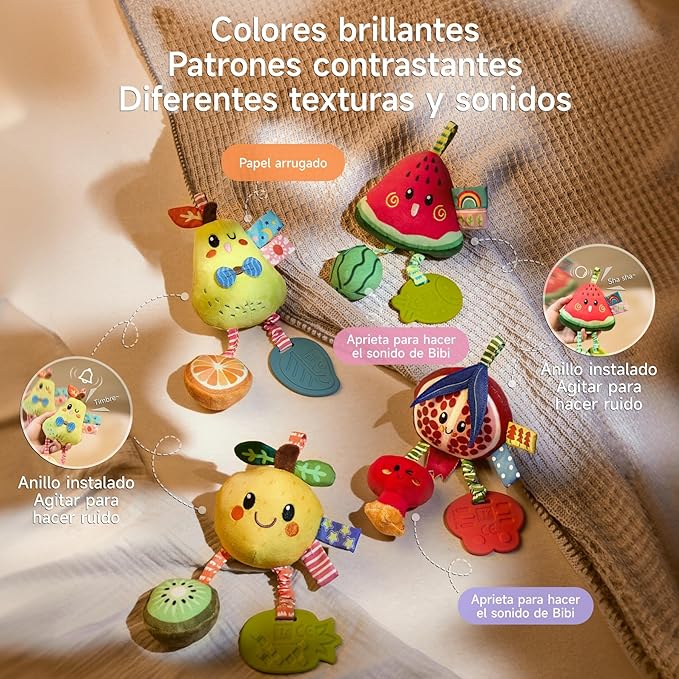 - ENHANCED INTERACTION: Engage and bond with your baby using this hanging rattle toy. Cheerful fruit toys (pear, watermelon,Lemon, pomegranate) that jingle, crinkle, or “bi-bi” when touched. Perfect for shared giggles or solo play—easily attach to play gyms or strollers. Durable, lightweight, and designed to nurture curiosity while giving caregivers flexibility.