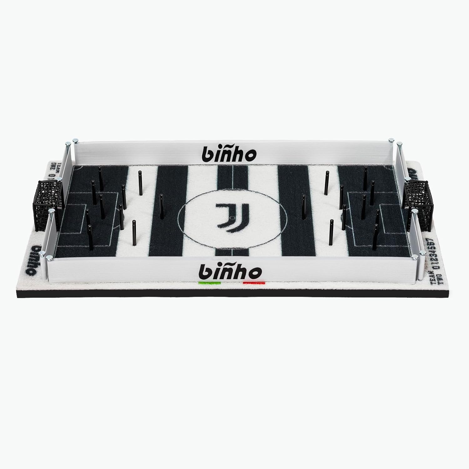 - Complete Set - Create memorable moments with our Binho Board Juventus FC. Each set comes with everything you need: 22” x 13” x 3” Binho board, 2 balls, 2 score pins, 2 red/yellow cards, 2 goals, 20 black metal removable player pieces, 12 barrier pieces, 6 white exterior elastic bands (2 long, 4 short), 1 rules pamphlet, and 1 drawstring bag.