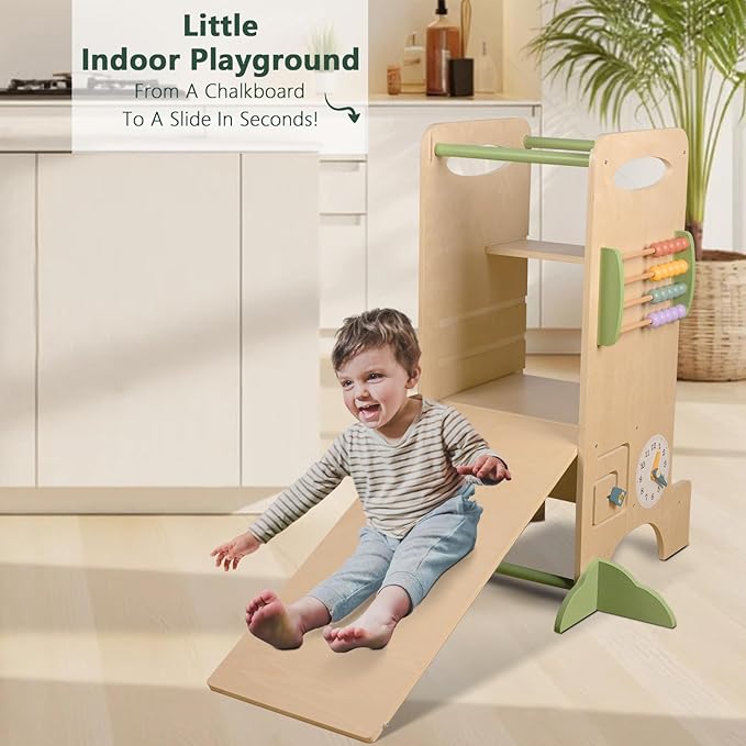- 8-in-1 Learning & Play Features: Includes a chalkboard, counting beads, gear toy, slide, xylophone, bead maze, clock, and more! Boosts fine motor skills, creativity, and cognitive development while keeping kids engaged