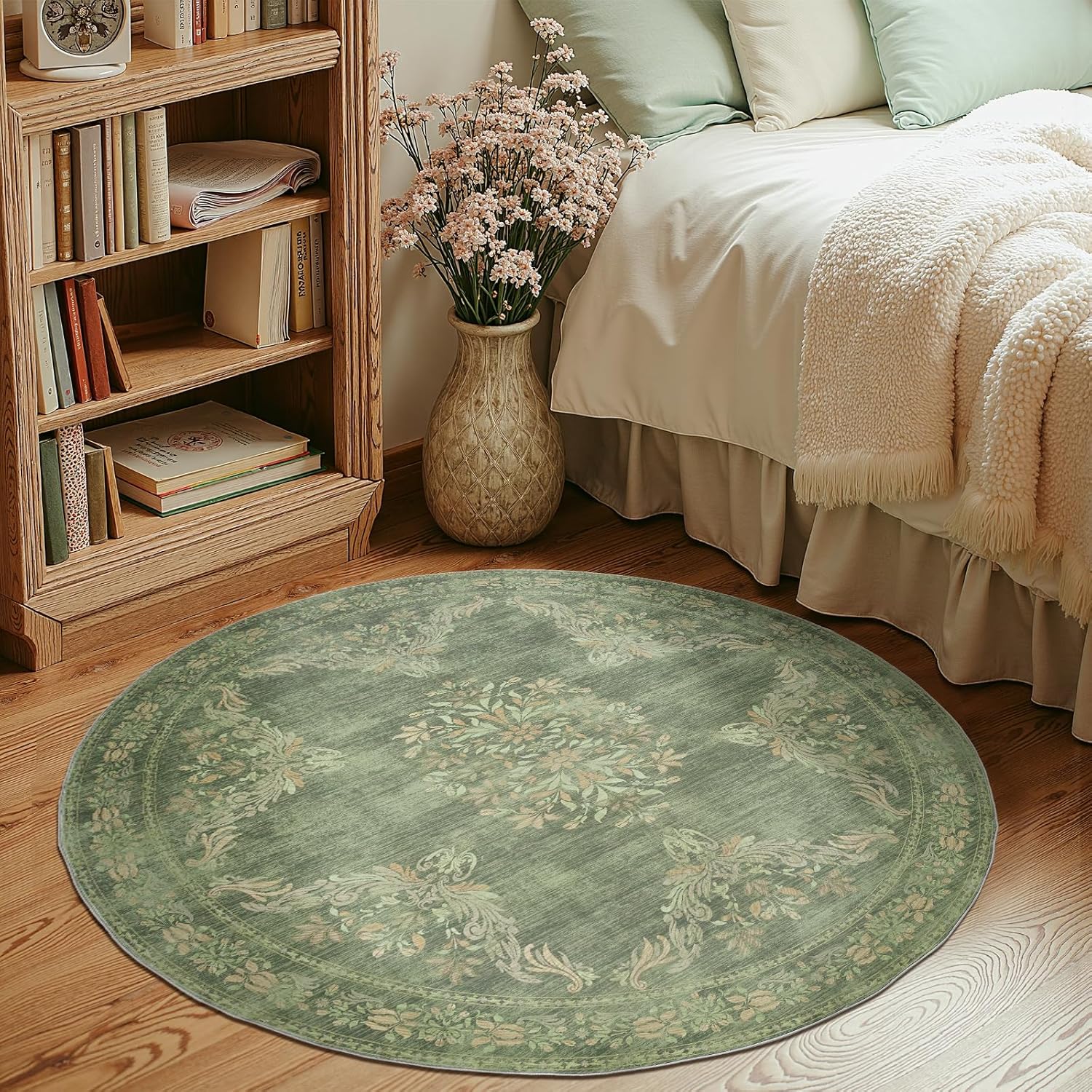 jinchan Round Rug 4ft Area Rugs Vintage Floral Distressed Design,Machine Washable Soft Non-Slip Low-Pile Ultra-Thin Circle Rug for Entryway Bedside Living Room Kitchen Nursery (4' Round,Dark Green)