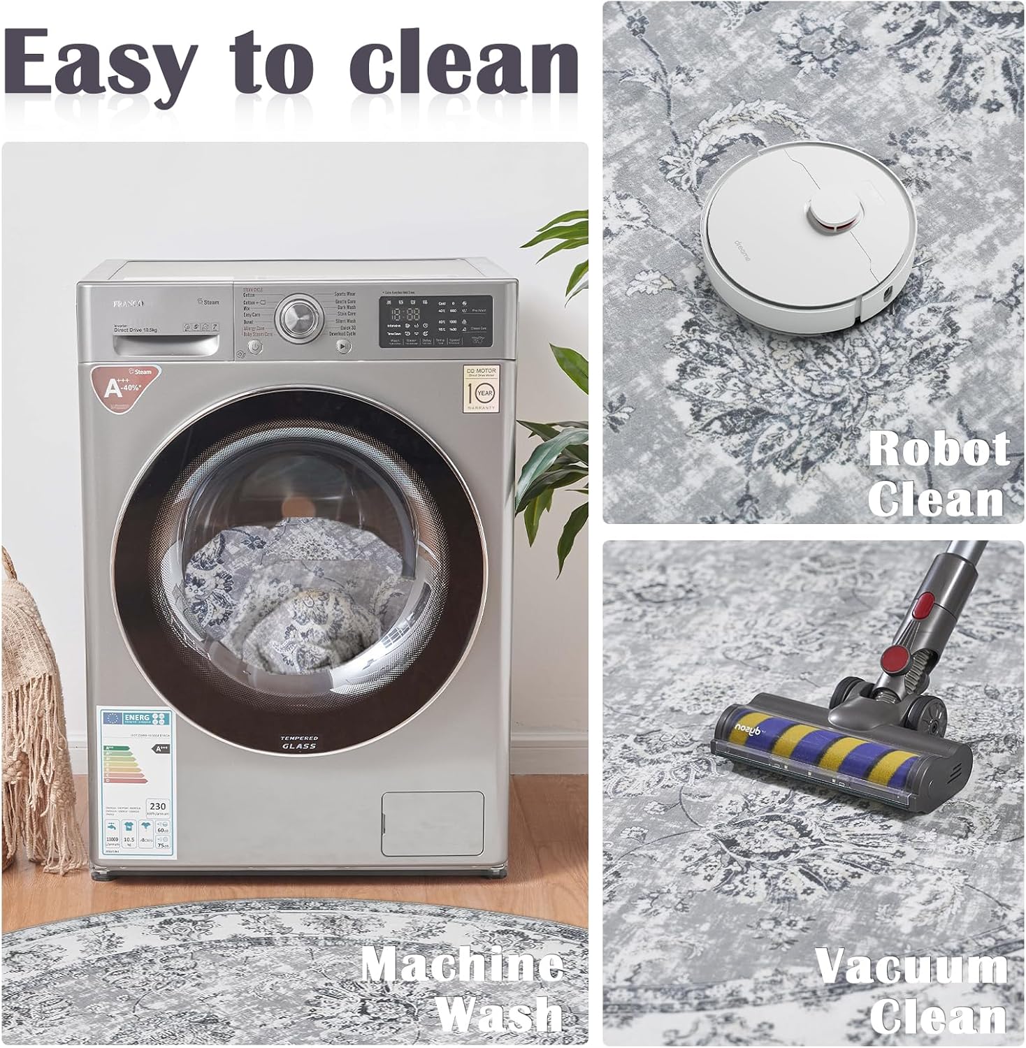 jinchan Round Rug 4ft Area Rug - Indoor Vintage Hallway Circle 4' Washable - Ultra-Thin Low Pile Soft Small Non Slip Distressed Floral Print for Living Room Dining Room Bedroom Entryway Grey