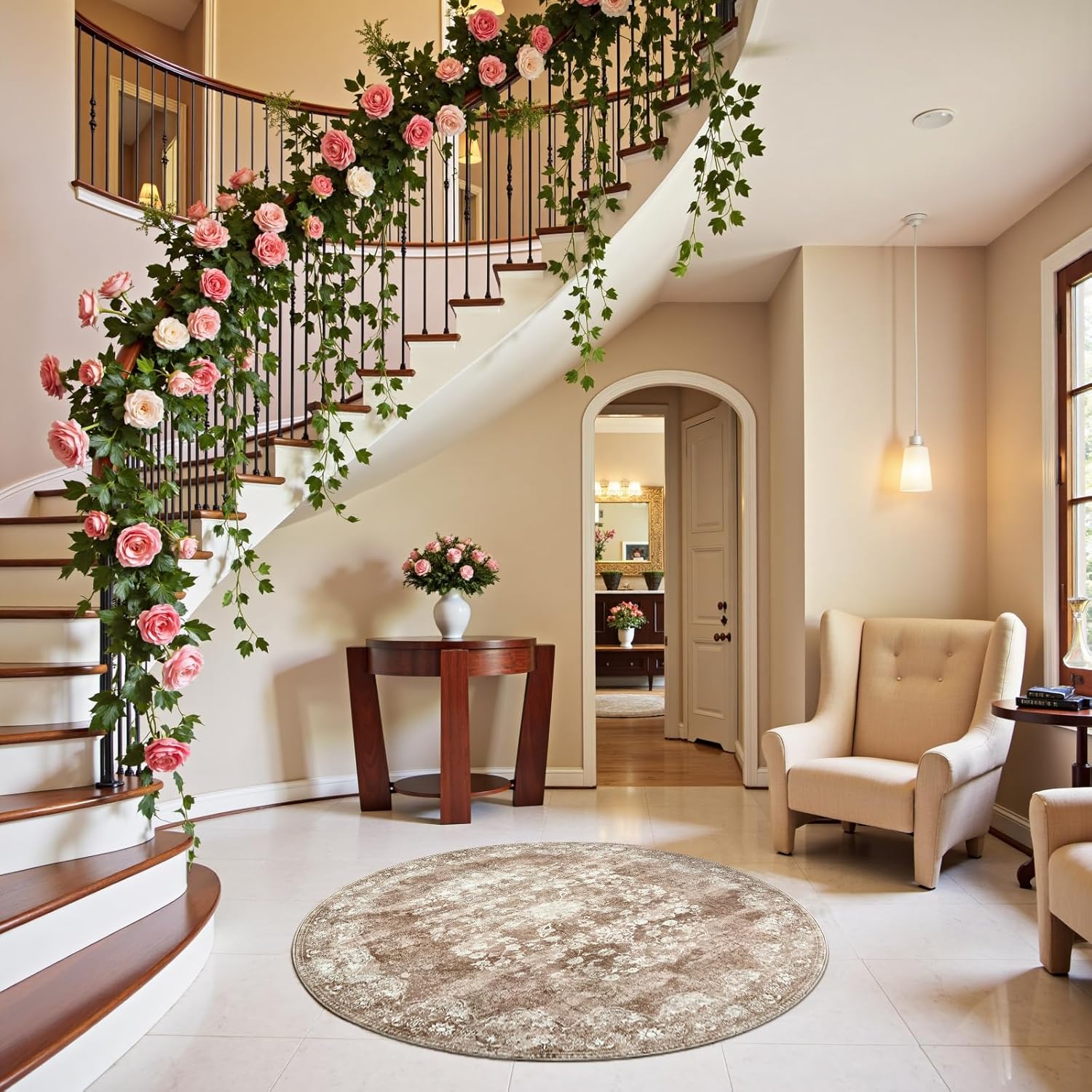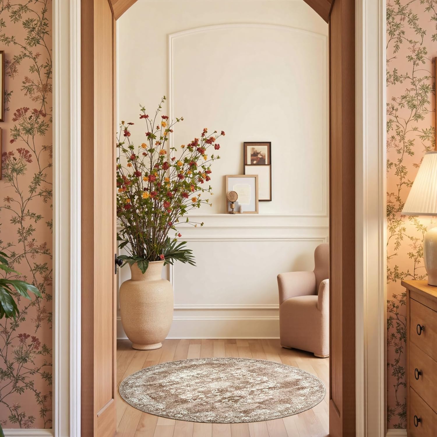 jinchan Round Rug 4ft Area Rug - Brown Vintage Floor Mat Kitchen Indoor - Washable Circle 4' Thin Floral Print Carpet Retro Farmhouse Non Slip Dining Room Living Room Bedroom Office