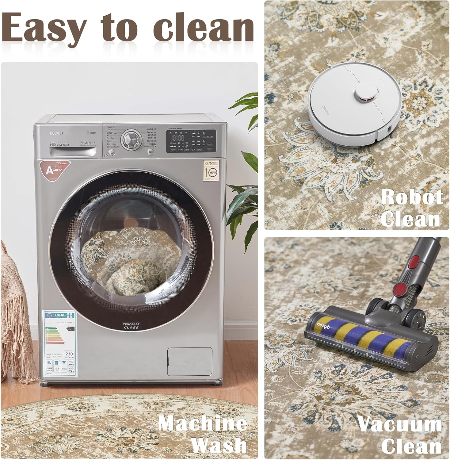 jinchan Round Rug 5ft Area Rug - Indoor Vintage Hallway Circle 5' Washable - Ultra-Thin Low Pile Soft Small Non Slip Distressed Floral Print for Living Room Dining Room Bedroom Entryway Taupe