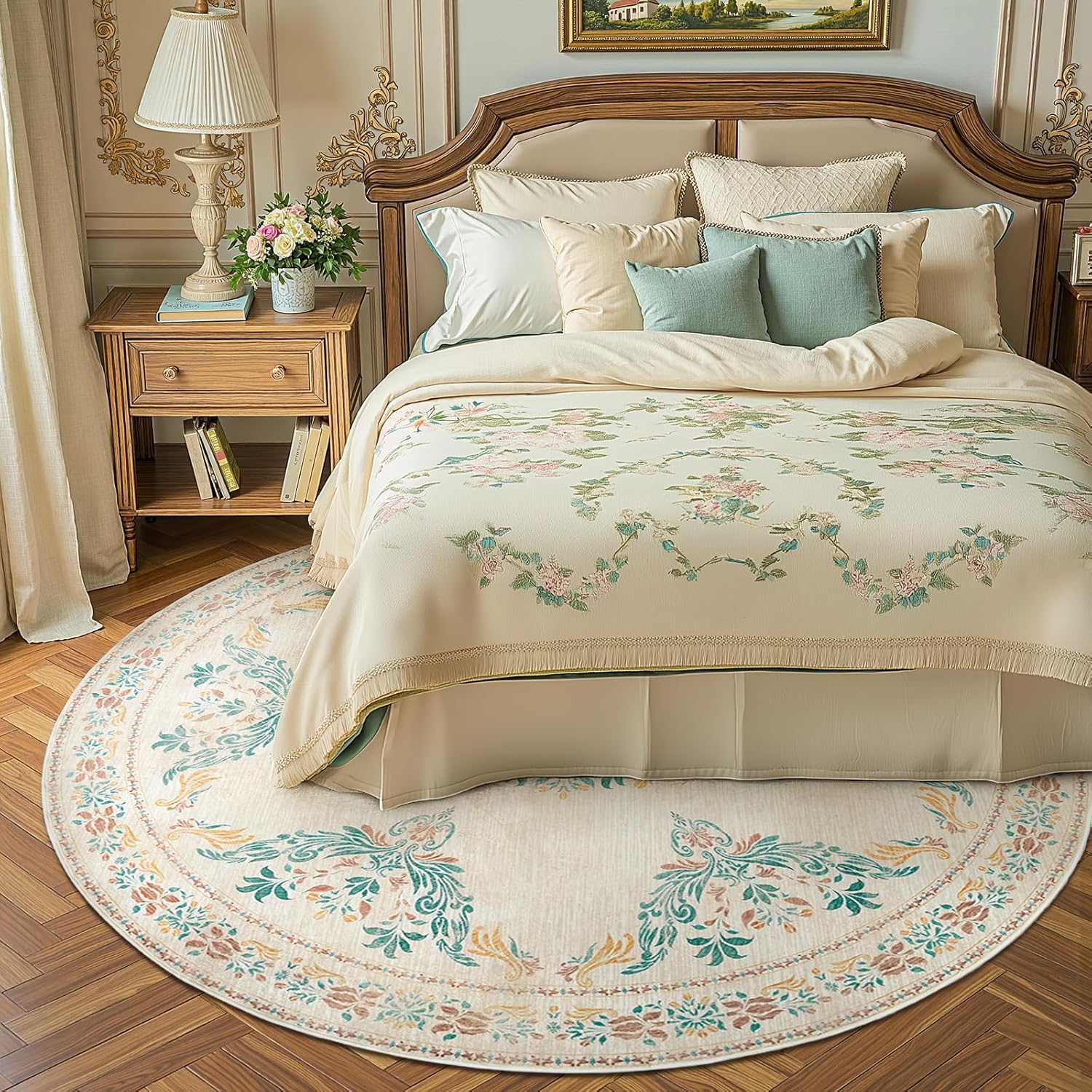 jinchan Round Rug 6ft Area Rugs Vintage Floral Distressed Design,Machine Washable Soft Non-Slip Low-Pile Ultra-Thin Circle Rug for Bedside Living Room Dining Room Bedroom (6' Round, Apricot Multi)