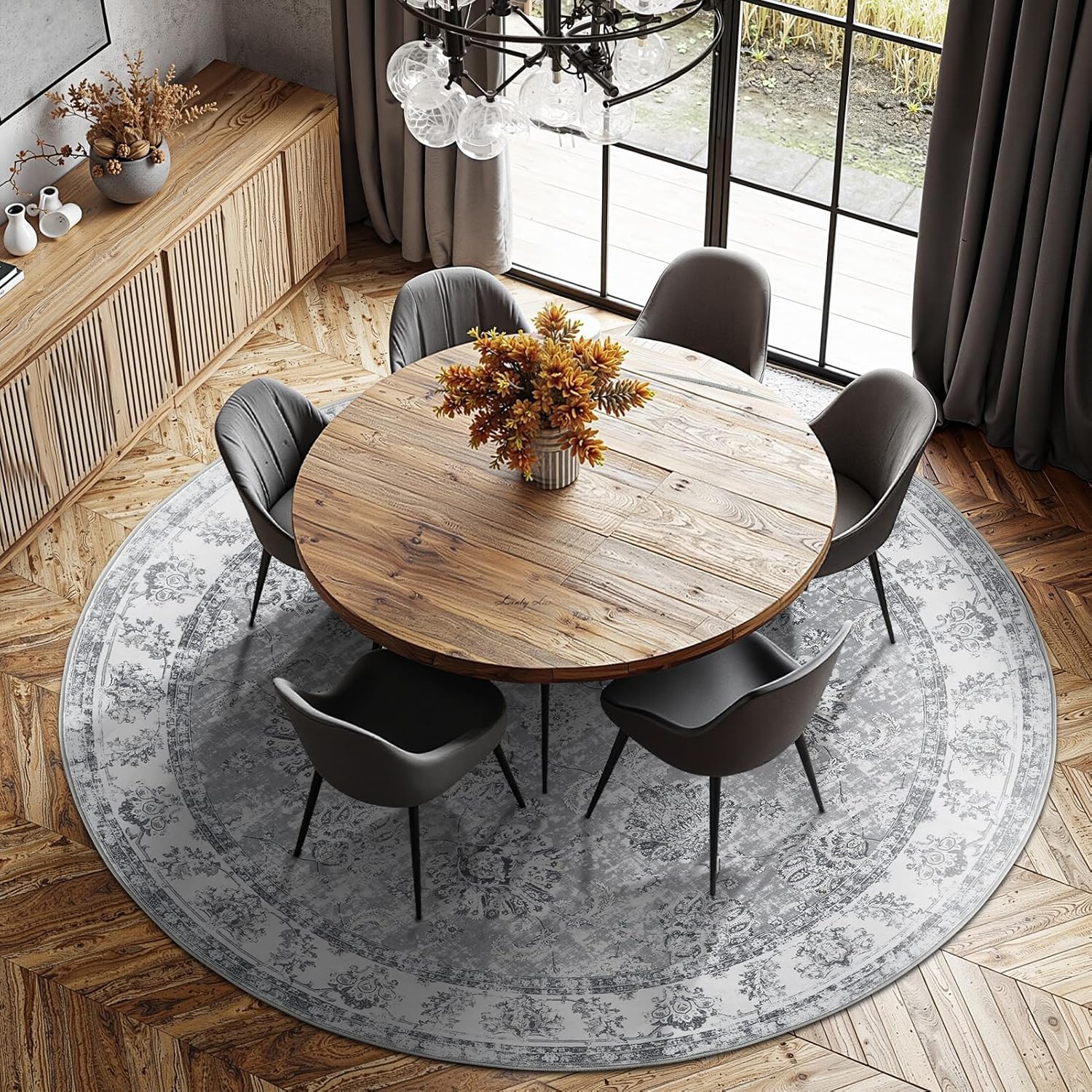 jinchan Round Rug 8ft Area Rug - Grey Vintage Floor Mat Kitchen Indoor Ultra-Thin Soft Floral Print - Washable Circle 8' Retro Accent for Farmhouse Non Slip Dining Room Living Room Bedroom Office