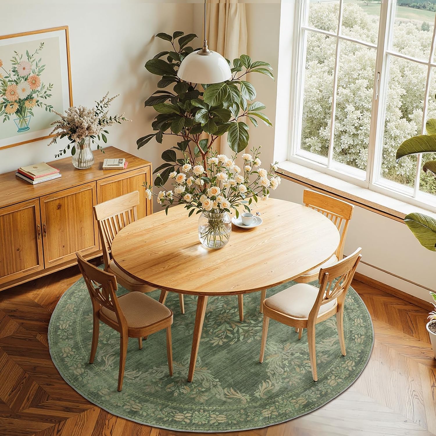 jinchan Round Rug 6ft Area Rugs Vintage Floral Distressed Design,Machine Washable Soft Non-Slip Low-Pile Ultra-Thin Circle Rug for Bedside Living Room Dining Room Bedroom (6' Round, Dark Green)