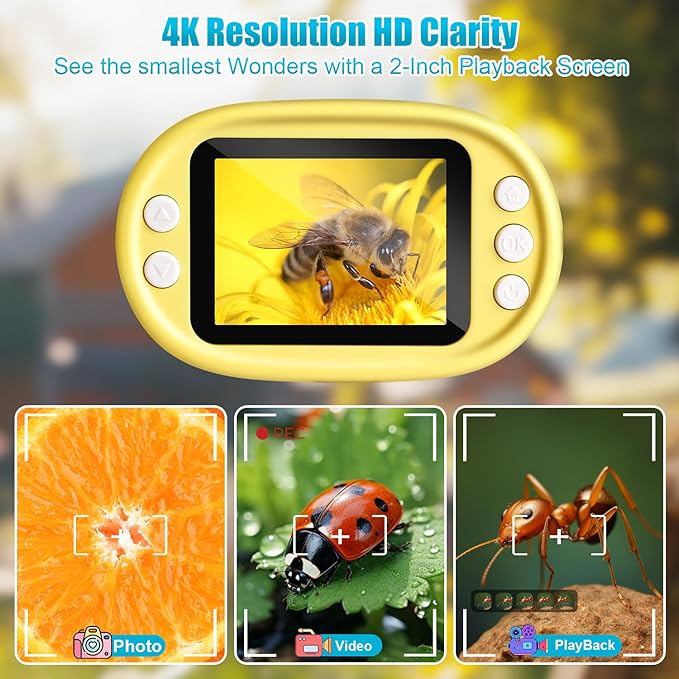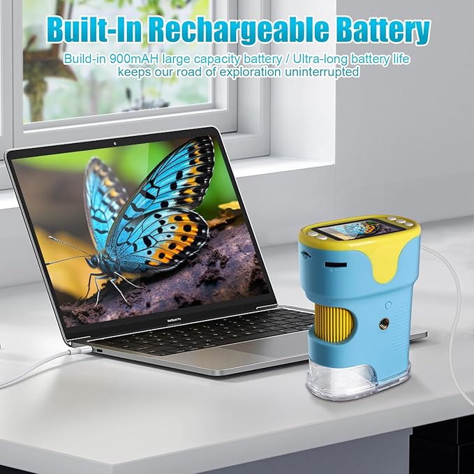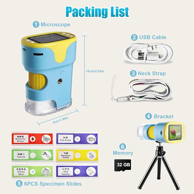 - 【Photo & Video Recording】The handheld microscope also supports real time photo shooting and video recording. Come with a 32G SD card, this mini microscope can store 4000+ photos or 30h+ videos. Our 2025 newest microscopes provide a Tripod for more stable photo quality, and also making kids to easily observe, record, and review clear, detailed images and videos.