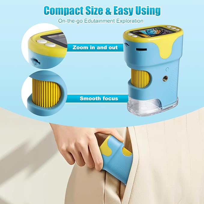 - 【Portable Pocket Microscope】This kids microscope weighs only 0.34lbs and 4*3*2 inch in size. It is small enough for your kids pocket or bags sacks, then you can bring the miniature microscope to school, mini-lab or outdoor to observe the microscopic world anytime and anywhere, also comes with a wrist strap to free your hands while running, and prevent accidental drops.
