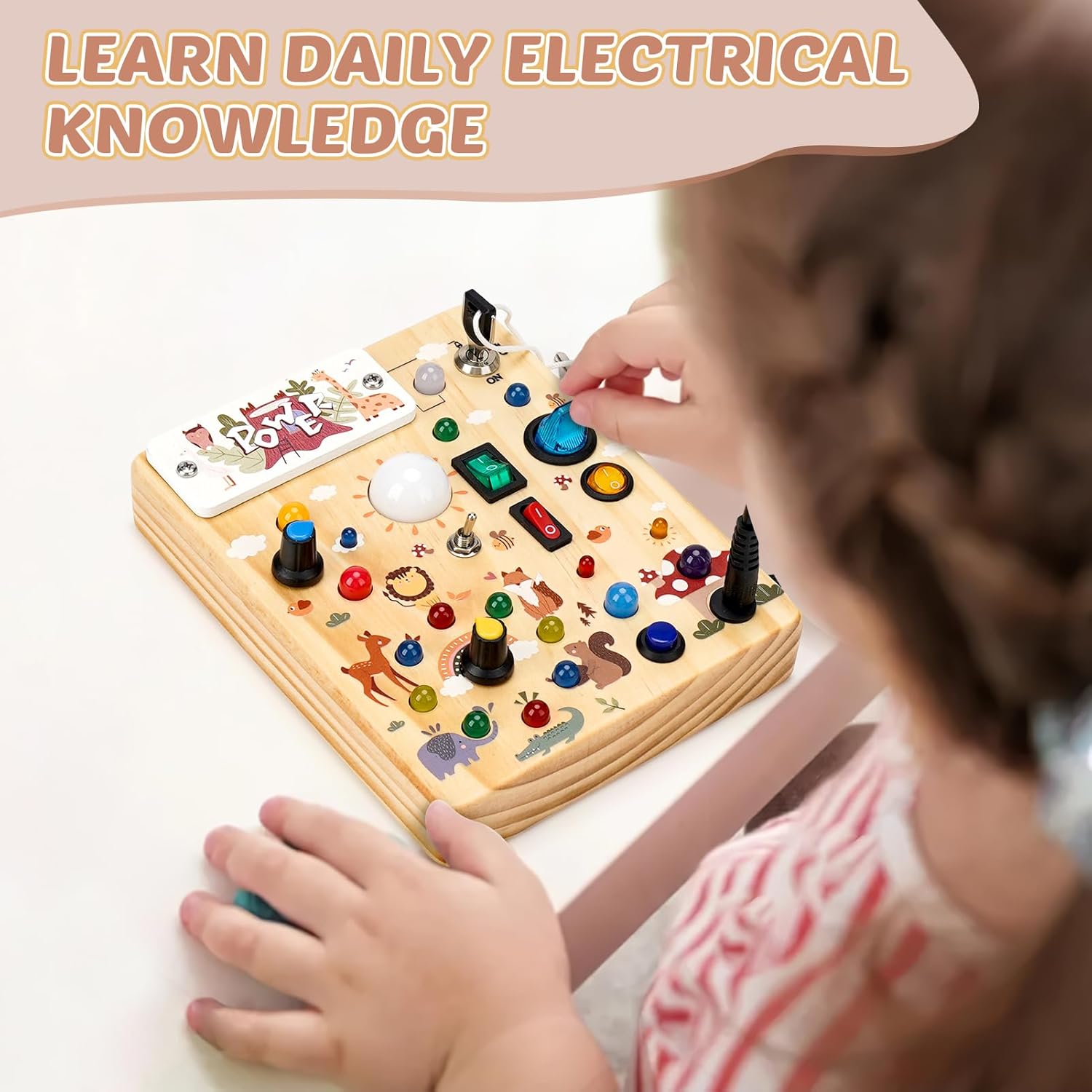 - [Curious Forest Theme Design] This busy board features an engaging forest-themed design with vibrant colors and 10 interactive switches paired with 19 LED lights. The busy board with led light are set to a perfect brightness level for children, ensuring they are neither too bright nor too dim. The total switch allows you to easily turn off all lights at once, saving energy and providing a fun sensory experience.Requires 2 AAA batteries (batteries not included).