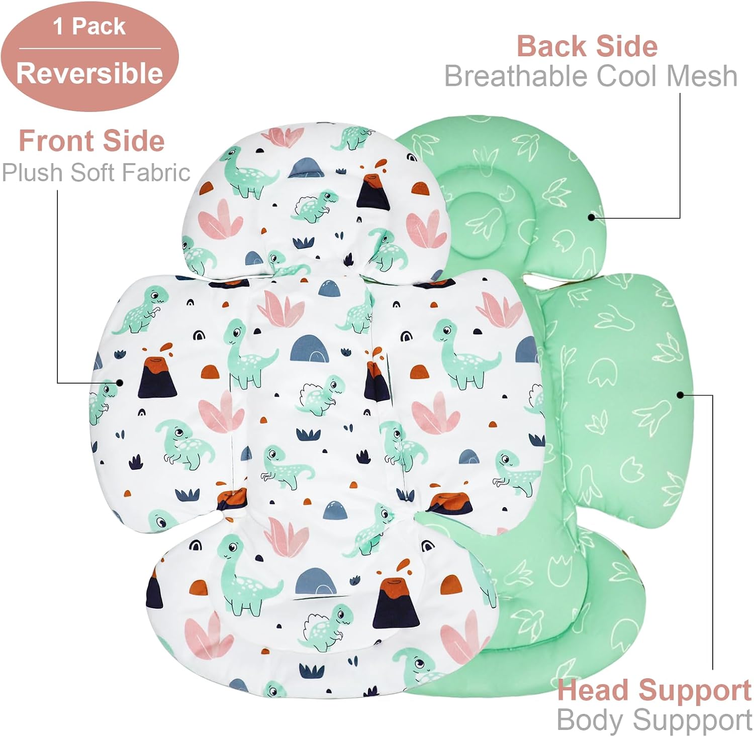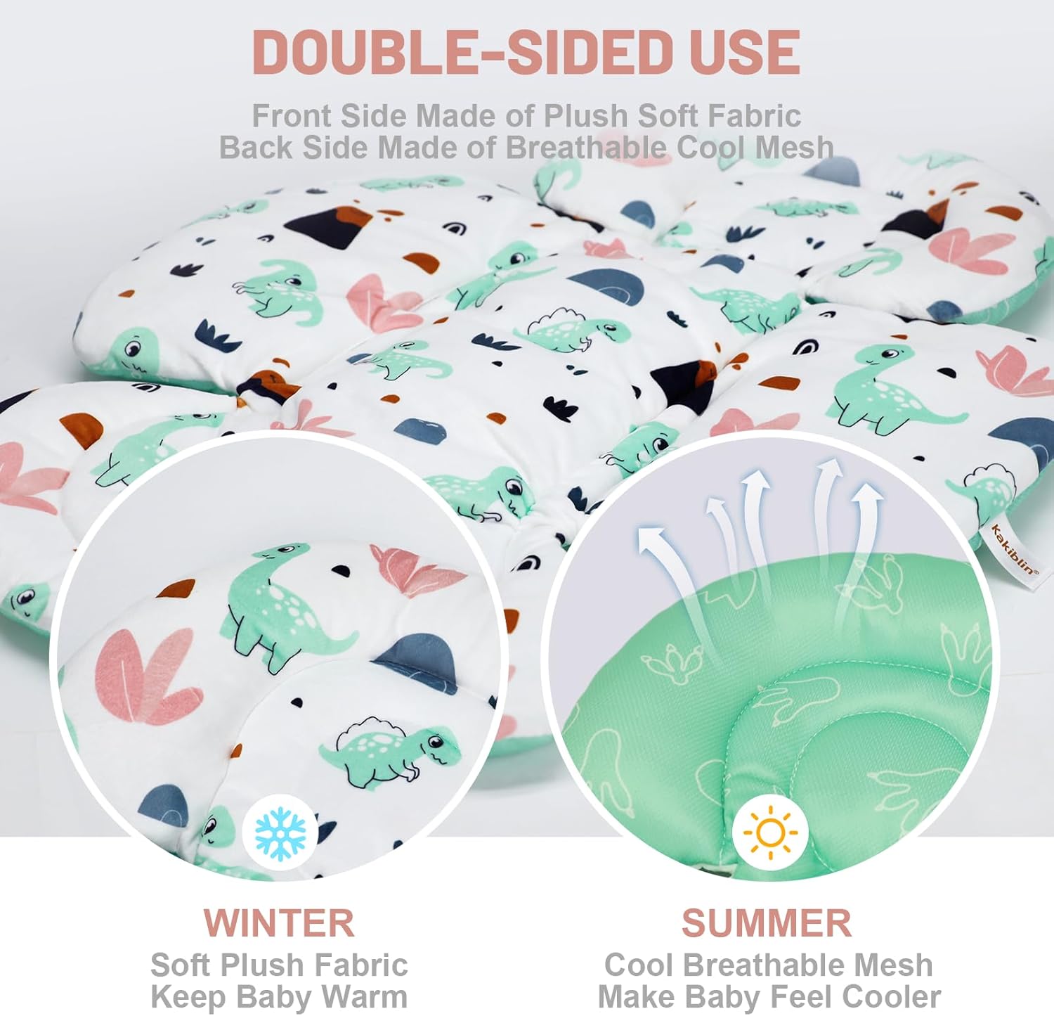 - Revesible for All Seasons: One side of the newborn car seat insert is made of soft plush velvet fabric keep babies warmer in winter, and the back side is made of cool breathable mesh that makes babies feel cooler in summer, both sides printed with different adorable patterns ,make your little one comfortable in no matter summer or winter
