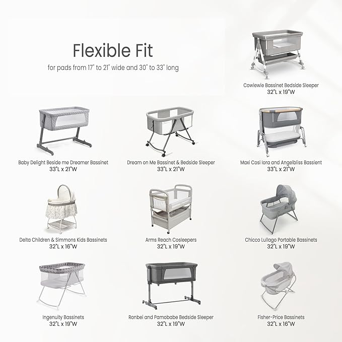 - Flexible Fitted: Our bedside sleeper sheets sized at 33" x 21" x 4" with elastic edges to securely fit most bassinet mattresses (29”-33” long, 17”-21” wide and 1”-2” thick). These bassinet sheets fitted for Maxi Cosi lora, Angelbliss, Baby Delight Beside me Dreamer Bassinet, and other similar-sized brands.