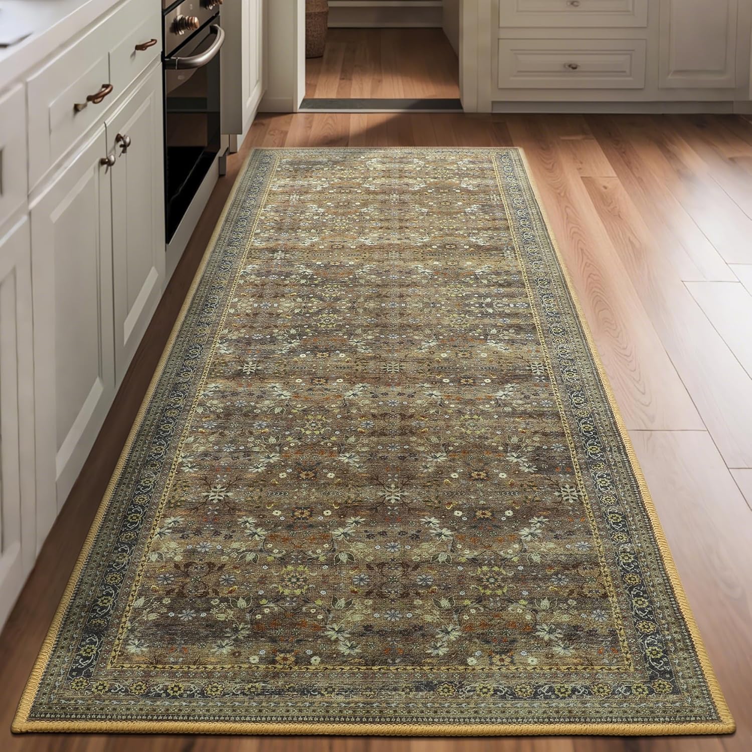 2x6 Washable Kitchen Runner Rug for Hallways, Non Slip Laundry Runners for Bathroom, Low Pile Rubber Backed Rugs for Entryway, Vintage Floral Carpet for Living Room Bedroom Brown/Yellow