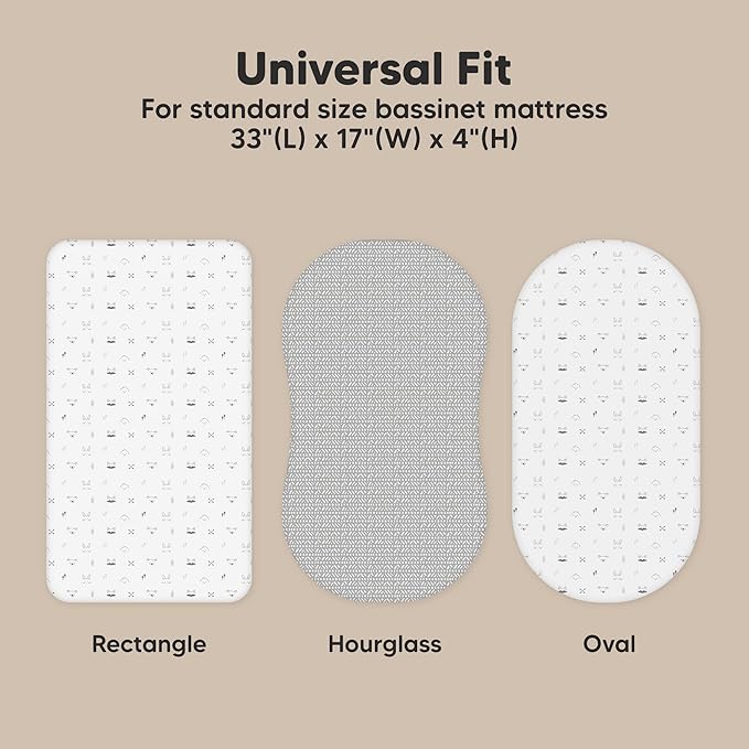 - 2-Pack Bassinet Fitted Sheets - KeaBabies Soothe Bassinet Mattress Sheets, sized at 33" x 17" with a depth of up to 4", provide a universal fit for all bassinet mattress pad types. They can be used as hourglass, oval, rectangle bassinet sheets.