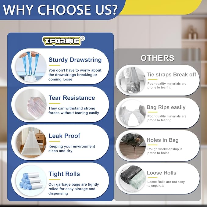 - 【Drawstring Convenience】 Easy-tie handles create odor-locking seals and make bag removal mess-free - no more spills or leaks during disposal.