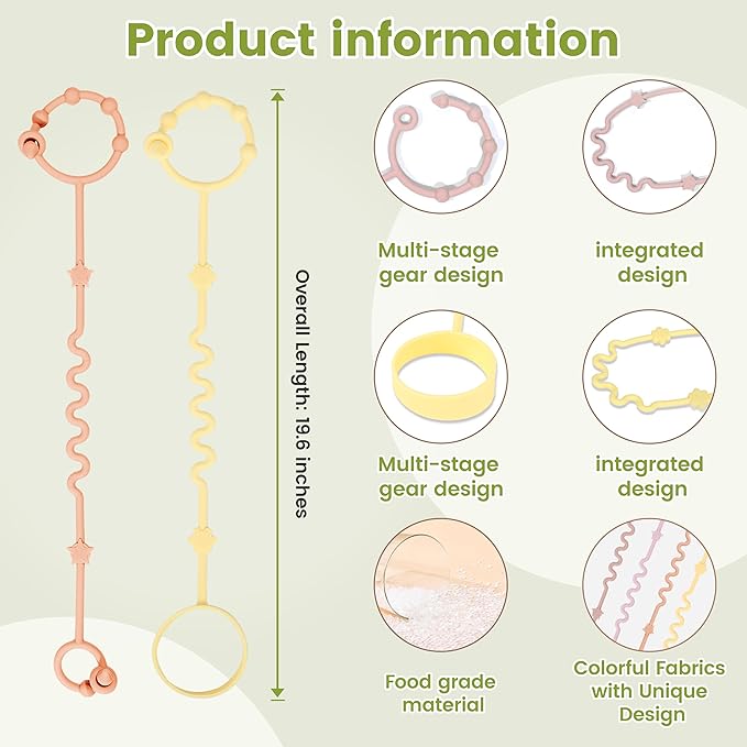 - Scope of Use: Baby toy straps can be used for strollers, baby high chairs, pacifier clips, teethers, car seat toys, baby sucking toys, and baby cribs. They can be taken out to play at any time, whether the baby is eating, crying, bathing, or traveling. Say goodbye to dropping and searching for misplaced baby essentials.