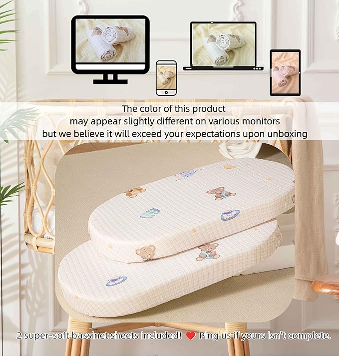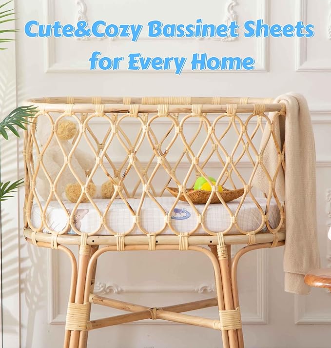 - 4.【Easy-care & Durable】: Our cozy bassinet sheets fit standard oval, rectangle, and hourglass bassinet mattresses. They're machine - washable, breathable, and quick - drying. Please Wash Before Use.