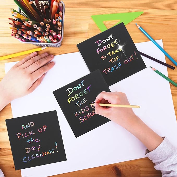 - Rainbow Glitter Design: Black-coated surface reveals vibrant rainbow glitter patterns when scratched, adds an extra dimension of magic to your creations, making each piece truly special, perfect for creating unique artwork and notes