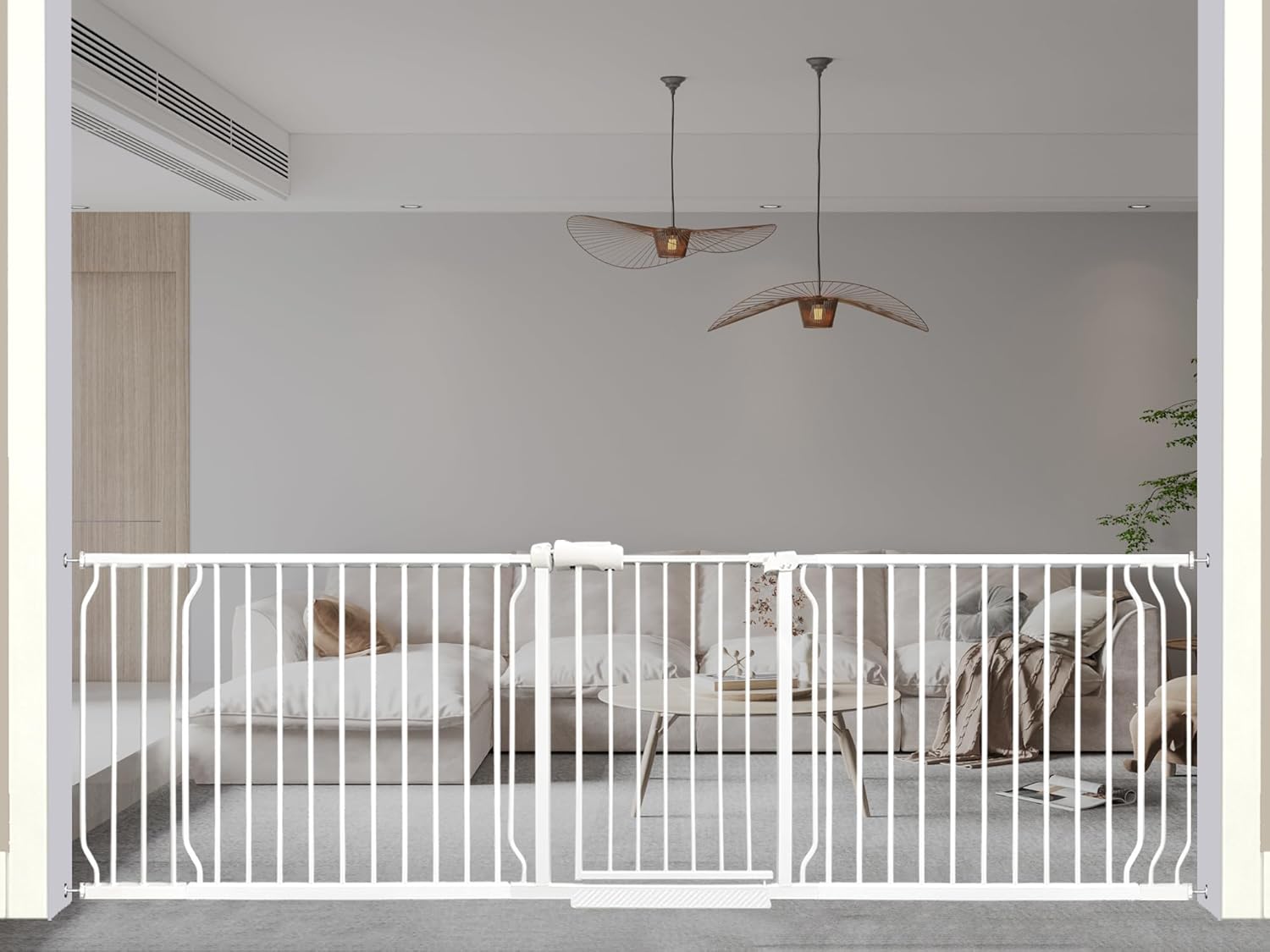 Heavy Duty Baby & Dog Safety Gate 86-104.7 Inch, White Metal, Tension Mounted No Drilling Pet Gate for Large Openings
