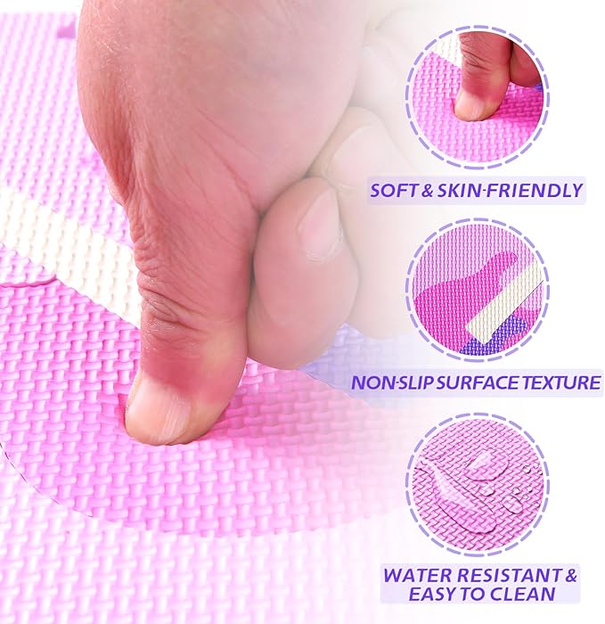 • ‌Safety & Easy Setup‌ --- 34"x34" soft EVA foam mat with interlocking tiles. 0.4" thick cushion prevents falls. Assemble in 5 mins – 9 base + 12 edge + 4 corner pieces. Meets ASTM F963-17 safety standards with phthalate-free materials