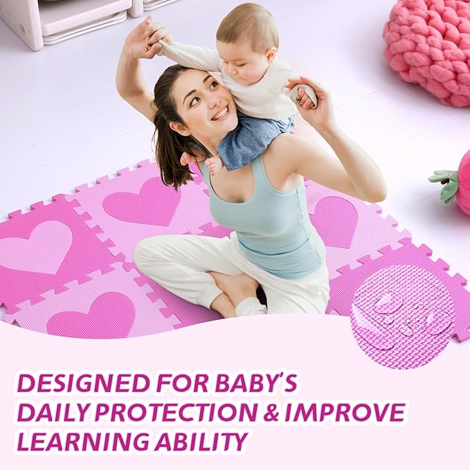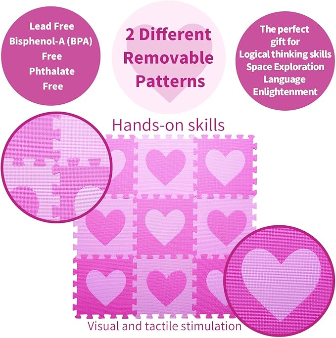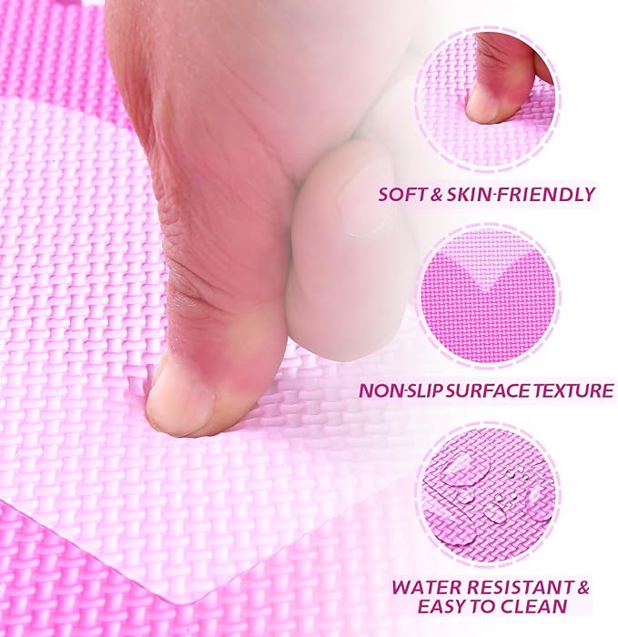 • ‌Safety & Easy Setup‌ --- 34"x34" soft EVA foam mat with interlocking tiles. 0.4" thick cushion prevents falls. Assemble in 5 mins – 9 base + 12 edge + 4 corner pieces. Meets ASTM F963-17 safety standards with phthalate-free materials