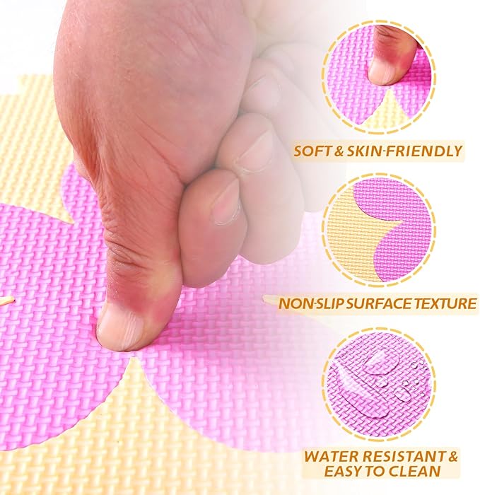 • ‌Safety & Easy Setup‌ --- 34"x34" soft EVA foam mat with interlocking tiles. 0.4" thick cushion prevents falls. Assemble in 5 mins – 9 base + 12 edge + 4 corner pieces. Meets ASTM F963-17 safety standards with phthalate-free materials