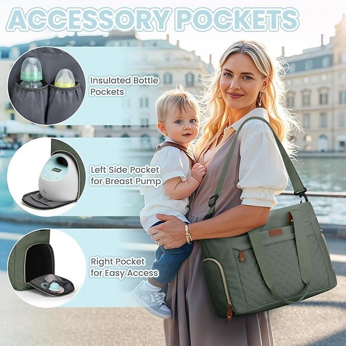 Diaper Bag Tote for Working Mom, Large Travel Diaper Tote for Mom and Dad with 14 Inch Laptop Sleeve, Mommy Maternity Travel Baby Bag for Boys and Girls, Green
