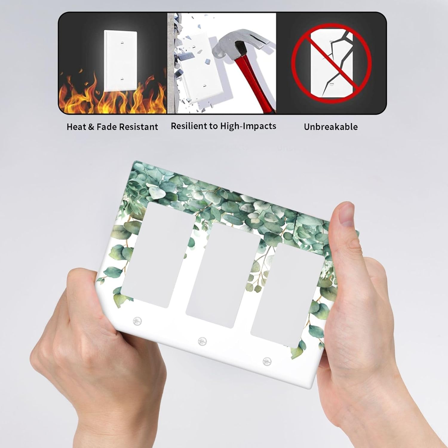 Decorative Outlet Covers Rustic Green Eucalyptus Leaves 3 Gang Wall Plate Triple Rocker Light Switch Cover Plate Jumbo Electrical GFCI Faceplate for Country Bedroom Home Decor