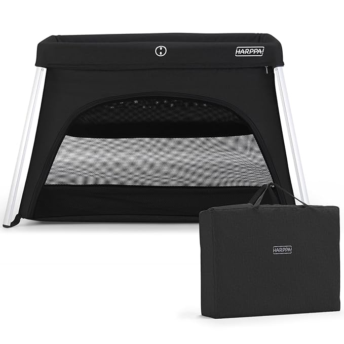 HARPPA Travel Crib with Comfy Mattress, Lightweight Portable Crib Requires No Assembly, Foldable Pack and Play for Baby and Toddlers, Compact Play Yard with Bed,Black