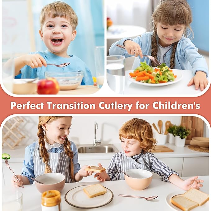 - IDEAL TRANSITIONAL CUTLERY: This set of 12 includes 6 kid forks and 6 kid spoons in rose gold. Ample quantity for daily needs by toddlers, kids, preschoolers, and school-age children, and allows for an easy transition to full-sized utensil