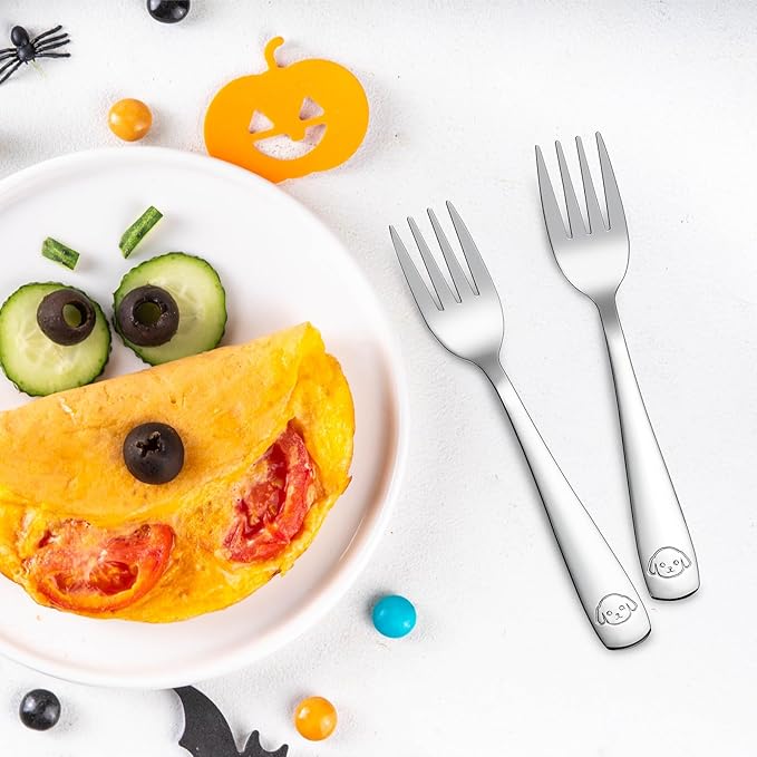 - DESIGNED FOR KIDS: Our ergonomically crafted handles ensure a cozy grip for tiny fingers.With smooth edges, short, rounded tines to easily get food into the mouth.Say goodbye to accidental stabs, ensuring a secure and comfortable self-feeding experience