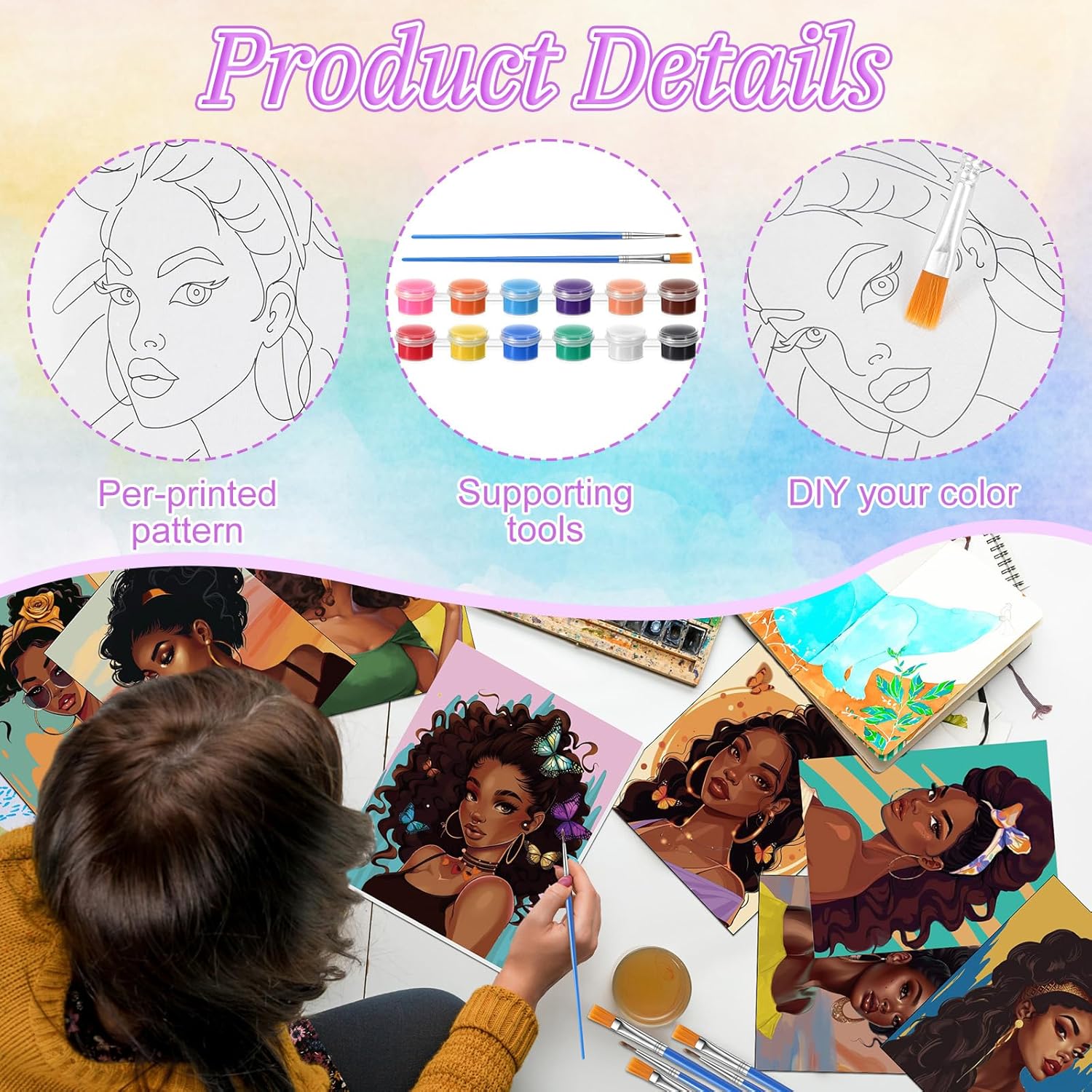 - 10 Pre Printed Canvases: 10 kinds of black women patterns are engraved on the pre drawn board; Include African women and other patterns, the size of: 7 x 5 x 0.1inch/18 x 13 x 0.3cm, cute and easy, you can use the provided paint to color according to your own aesthetics, improve your painting creativity in the process, and also reduce stress and relieve anxiety