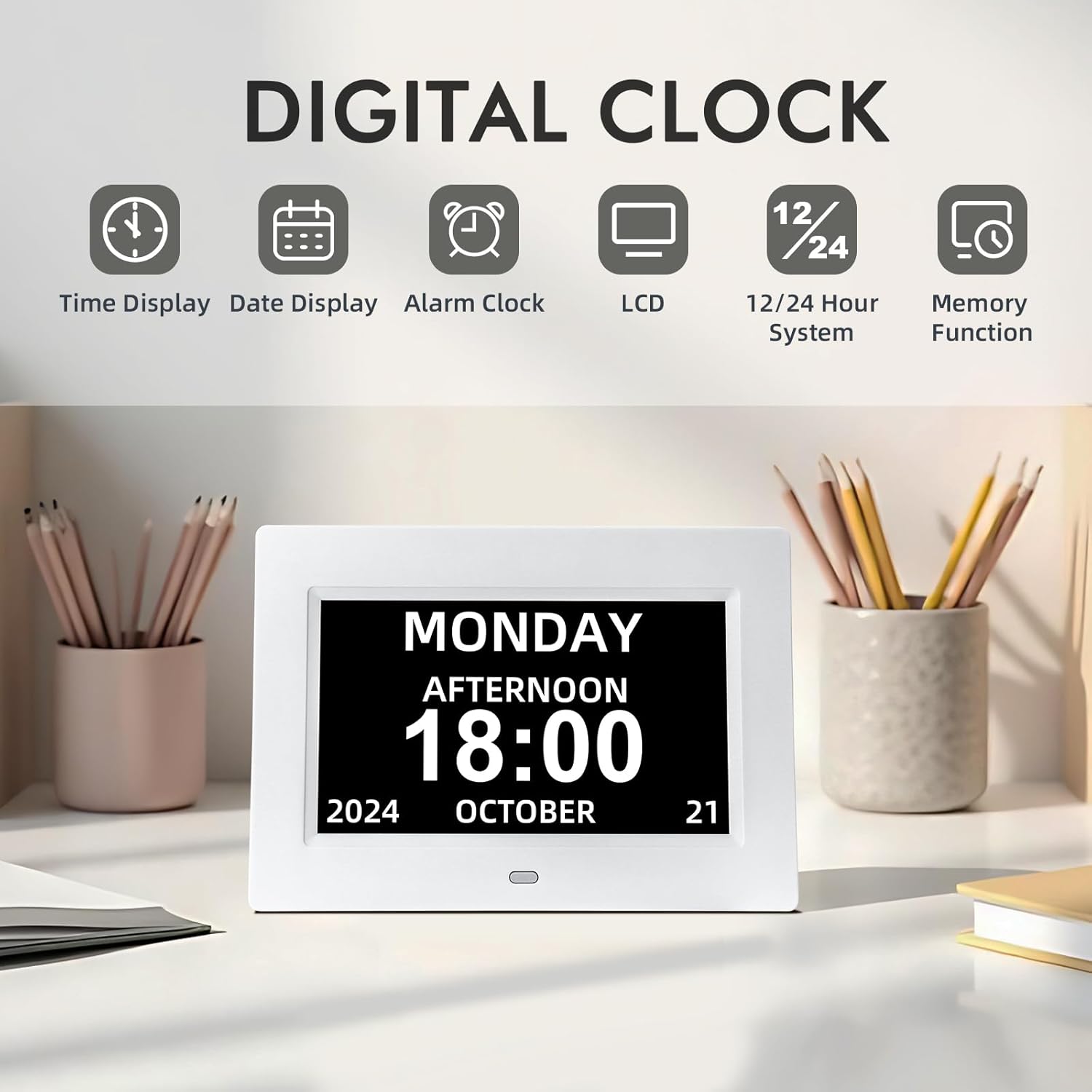 Digital Calendar Alarm Clock for Seniors - 7" Large Display with Day/Date, 12 Custom Alarms & Auto-Dimming | Medication Reminder, Dementia-Friendly Design, Easy Read (White)