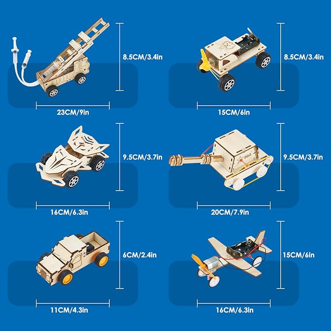 - Wooden 6-in-1 STEM Set -- The science set includes six sets: four-wheel drive car, wind-driven car, wooden tank, hydraulic fire truck, pull-back car, and airplane. Each set has a different scientific and educational experience and is a good experimental toy for exploring science