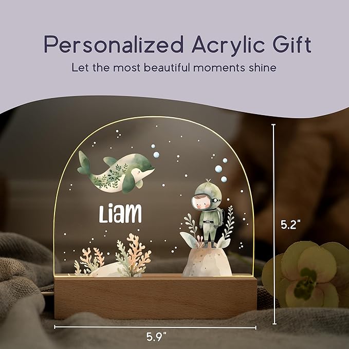 - Crafted from crystal-clear acrylic and a sturdy wooden base, this personalized baby night light offers a safe, non-toxic design, perfect for any nursery or child's room.