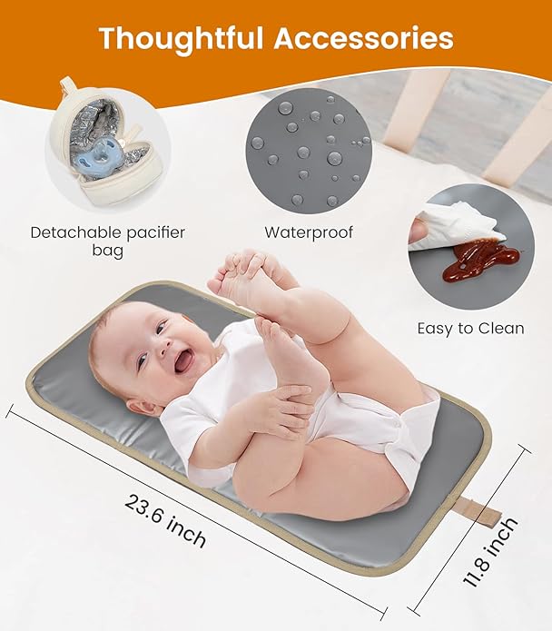 - Thoughtful Design: 1 shoulder strap + 1 diaper bag + 1 pacifier bag included. The detachable shoulder strap can be carried diagonally or hung on the stroller, effectively freeing your hands and reducing the burden. When you need to change your baby's diaper, the waterproof diaper pad is a good helper. In addition, the separate pacifier bag is also more hygienic!