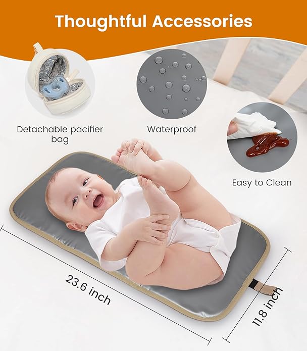- Thoughtful Design: 1 shoulder strap + 1 diaper bag + 1 pacifier bag included. The detachable shoulder strap can be carried diagonally or hung on the stroller, effectively freeing your hands and reducing the burden. When you need to change your baby's diaper, the waterproof diaper pad is a good helper. In addition, the separate pacifier bag is also more hygienic!