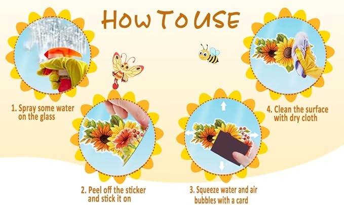 - 🌻DOUBLE-SIDE & ANTI-COLLISION: Our clings are double-sided printed so that you can see the image from both sides of the window. A good way for collision prevention. Also Great for decorations, can be applied to windows, doors, floor, fridge, glasses, bathroom, home appliance, air-condition, office, dorm, or retail store, mirrors, and the majority of glossy surfaces.