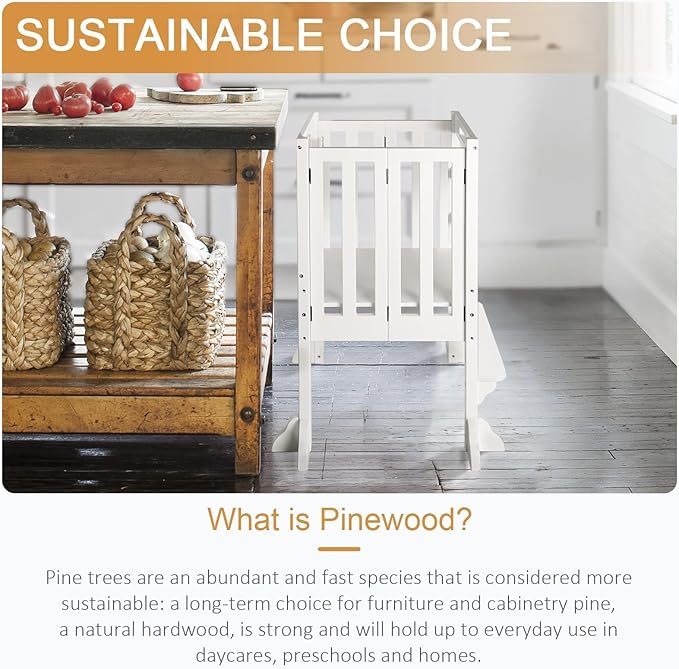 - 100% PINE WOOD: This durable stool is made from 100% pure pine wood with a child-safe, non-toxic finish. This toddler standing stool is very space-efficient due to its folding design. You can put this toddler kitchen stool away in the corner when you don't need it