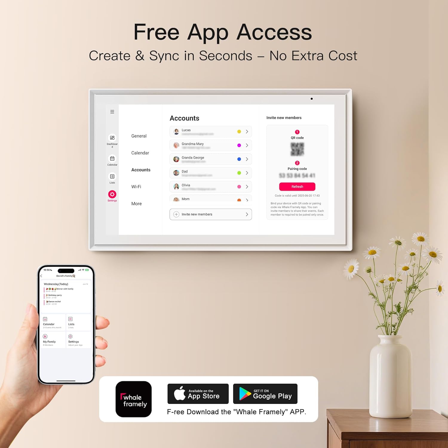 - 【Easy Use Smart Family Calendar Planner】① Just plug it in and get started—no tech skills required. ; ② Edit anywhere - Add events on digital calendar or via the “Whale Framely” app - All changes sync between the device and app; ③Privacy by Design - this smart calendar display shows full family schedules, while your app shows ONLY your own plans. Your family’s data stays private and secure, with protection that meets international privacy standards — no s-ubscriptions needed.