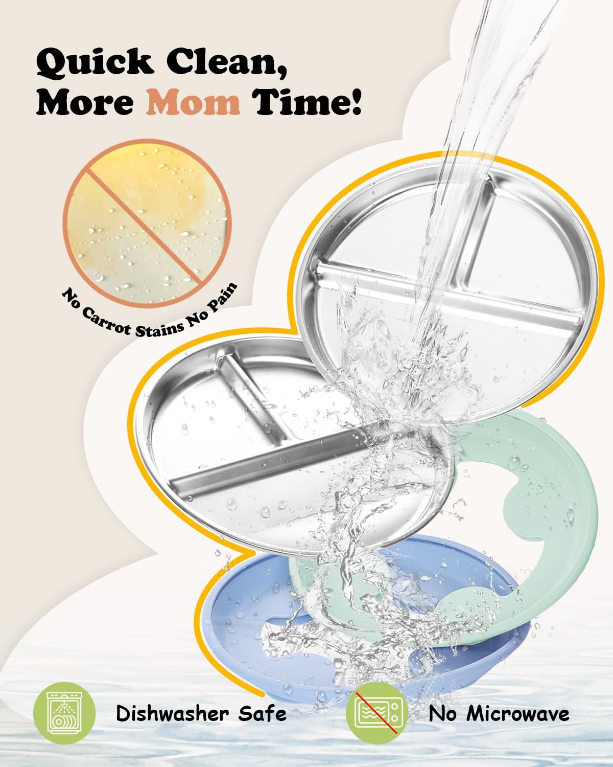 - No Plastic Taste. No Soap Smell. No Stains: The smooth, BPA-free, lead-free stainless steel surface of these kids plates, made from food-grade 304 stainless steel—safe, durable, and won't absorb odors or stain from carrots or berries—solving common issues with traditional baby silicone/plastic plates. Enjoy fresh, natural-tasting meals every time