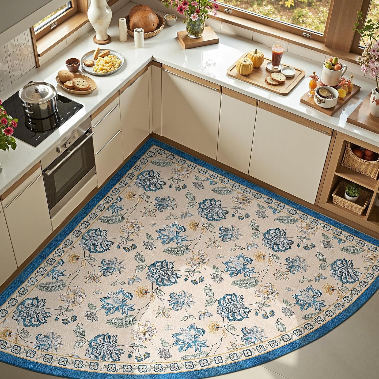 jinchan Floral Corner Rug for Living Room Washable Bedroom Rug Vintage Romance Design Non Slip Quarter Circle Lightweight Low-Pile Throw Carpet for Reading Nook Playroom,6ft Radius, Blue/Beige