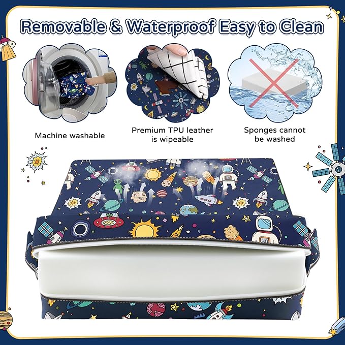 - 【Cute appearance】: We have carefully designed various colors and a variety of interesting cartoon patterns for the booster seat, such as astronauts, spaceships, aliens, satellites, airplanes and other science fiction patterns, bright colors, full of childlike fun, deeply loved by children, and stimulate their interest. This baby booster seat for table can give your baby an equal opportunity to dine with adults, allowing children to enjoy a wonderful family dining time.