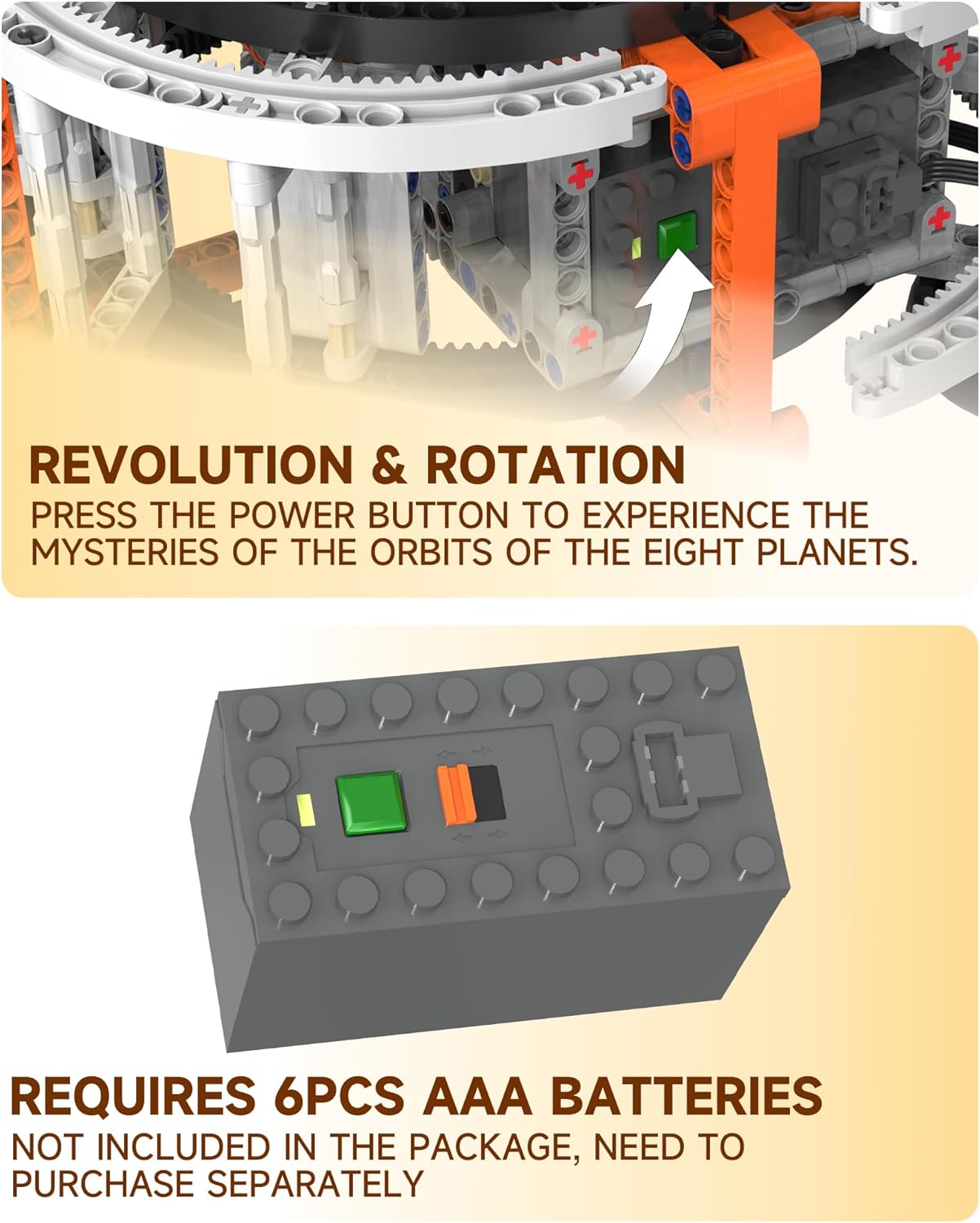 - 【Rotatable Solar System】In addition to manually rotating the joystick to simulate the planetary revolution and rotation, solar System Model Kit is also equipped with an L-motor and a battery box, and requires 6pcs AAA batteries (AAA batteries are not included in the package). Just press the power button and the model will simulate the rotation and revolution of the planets. Children can observe the movement patterns of celestial bodies through realistic planetary orbits.